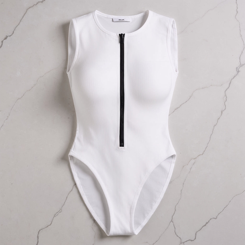 - Details: ribbed fabric, round neckline, sleeveless, short matte black front zipper, slim fit, clean finishing, secure snap button and velcro closure at the crotch
