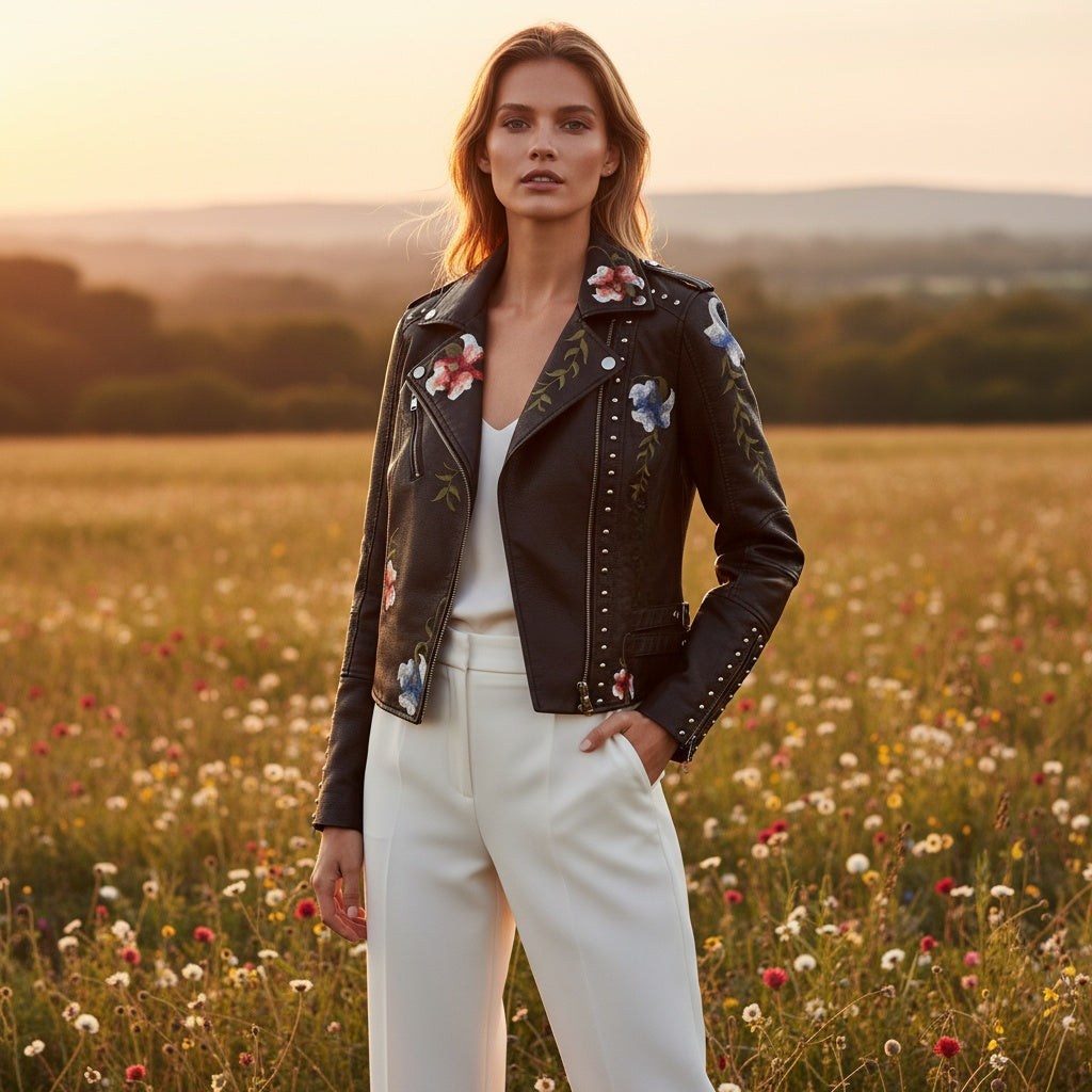 - Details: smooth finish, detailed floral embroidery, metallic snap buttons, short fitted cut