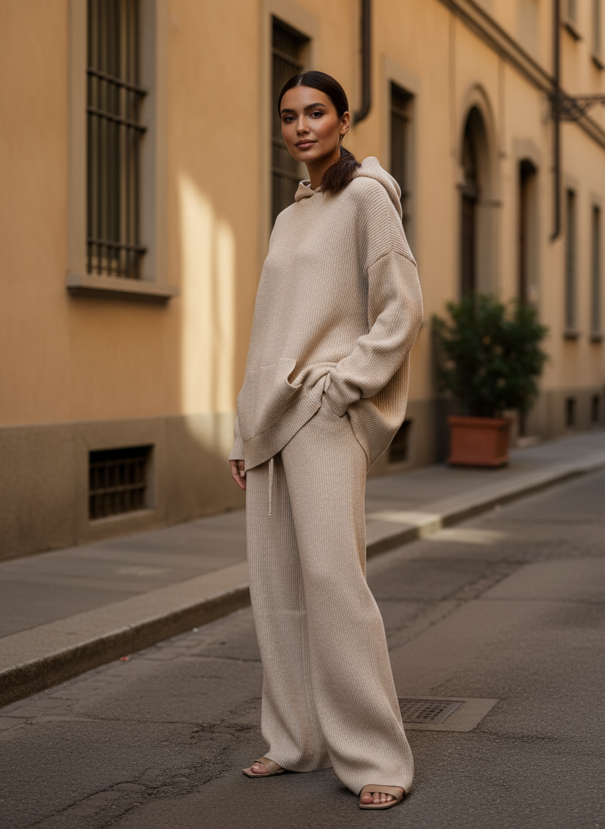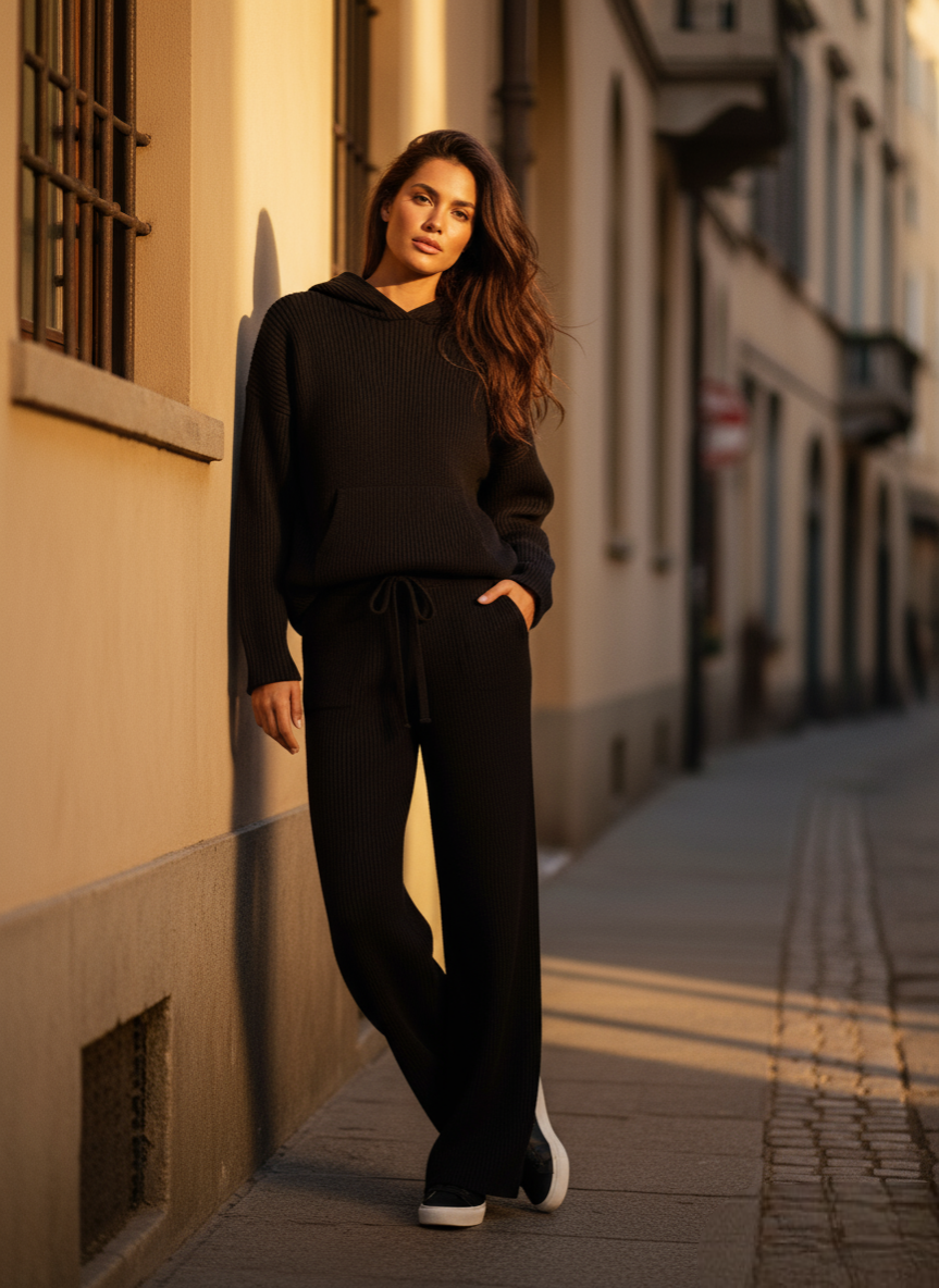 - Details: breathable knit texture, elastic waistband with drawstrings, oversized hoodie with front pocket, clean modern finish.